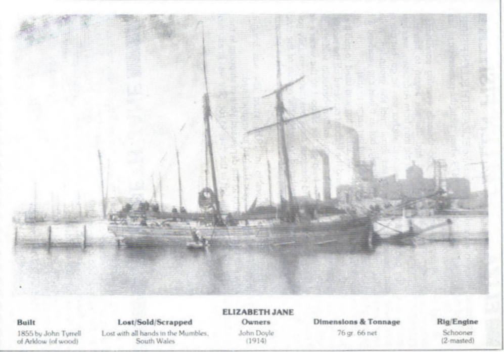 | 1865 | ELIZABETH JANE | 76G; 2-masted schooner; Owner 1897, J Doyle; By 1915, registered in Wexford. Lost with all hands 27 December 1915 at Mumbles; Photo credit: R J Scott |