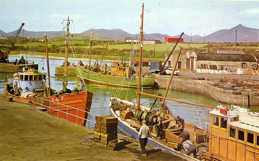 | Kilkeel view, 1960's | Castle Dawn (N147), Spes Melior (N145) and Melita (N160); Kilkeel Harbour. Photo credit:- Unidentified photographer, Jigsaw by Tower Press, London |