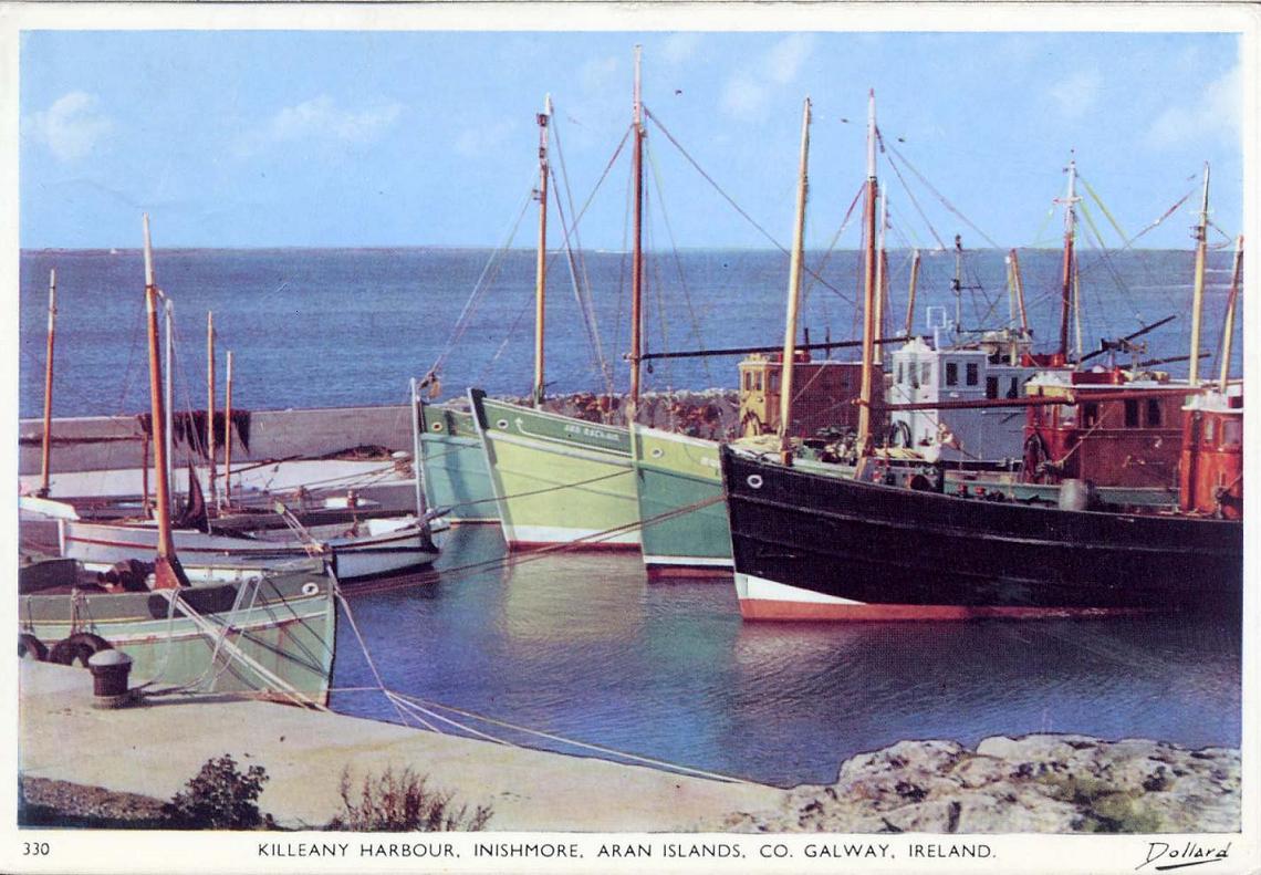 | ? | Killeany Harbour, Aran Islands The black boat is Ros Breasail, then Ros Ronain, Ard Rathain & Ros Éinne Photo credit:- Unidentified photographer, postcard published by Dollard. Ref.no. 330 |