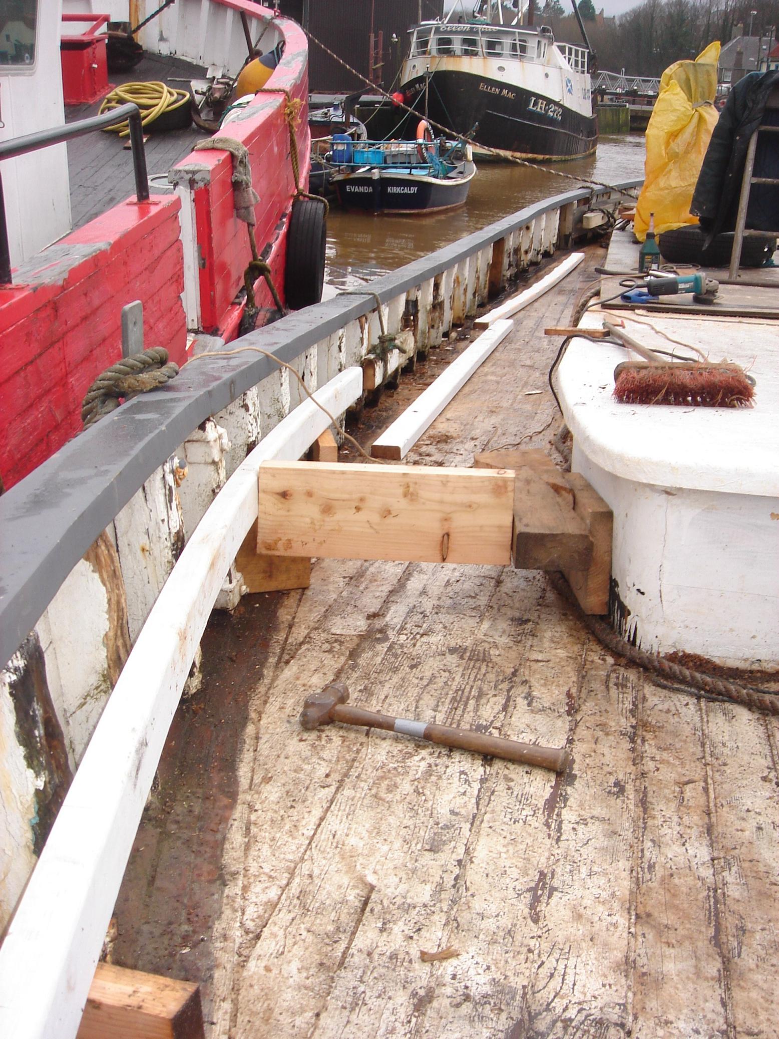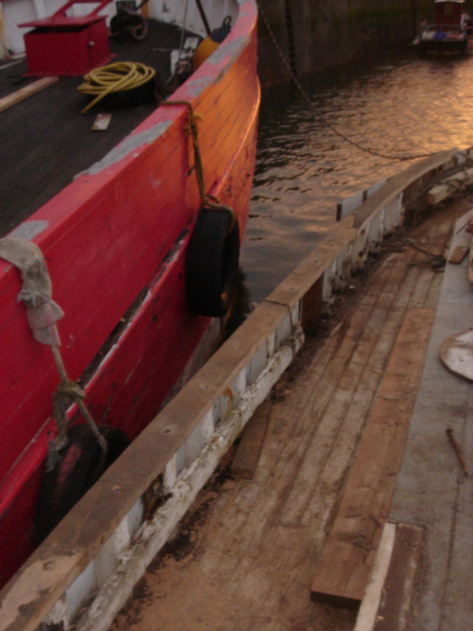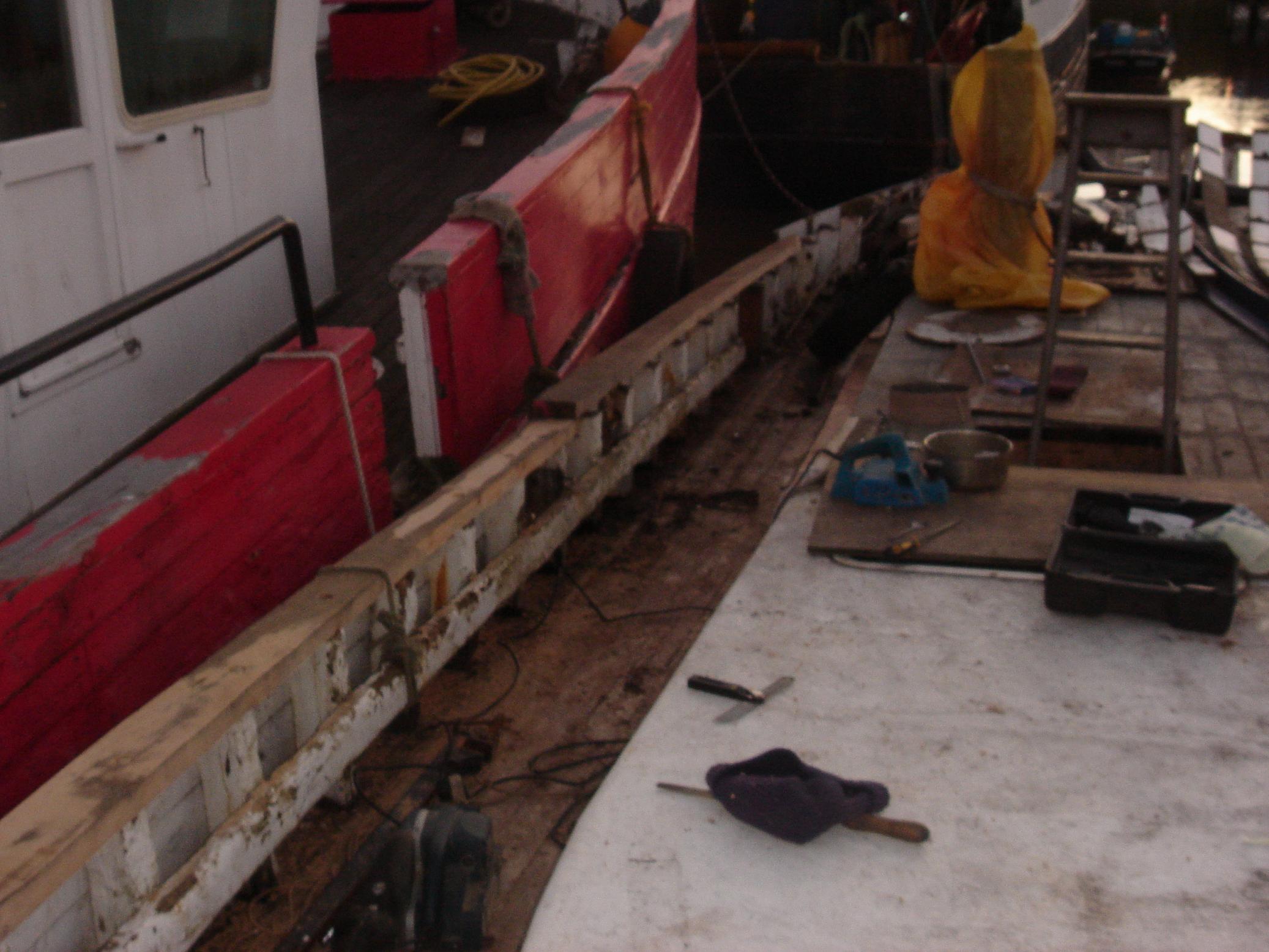 | 08/11/2013 | The rubbing strake, port side has a new top surface. Originally to be replaced but a 7"x3.75" beam, through bolted, was just too much… | DSCN4179 |