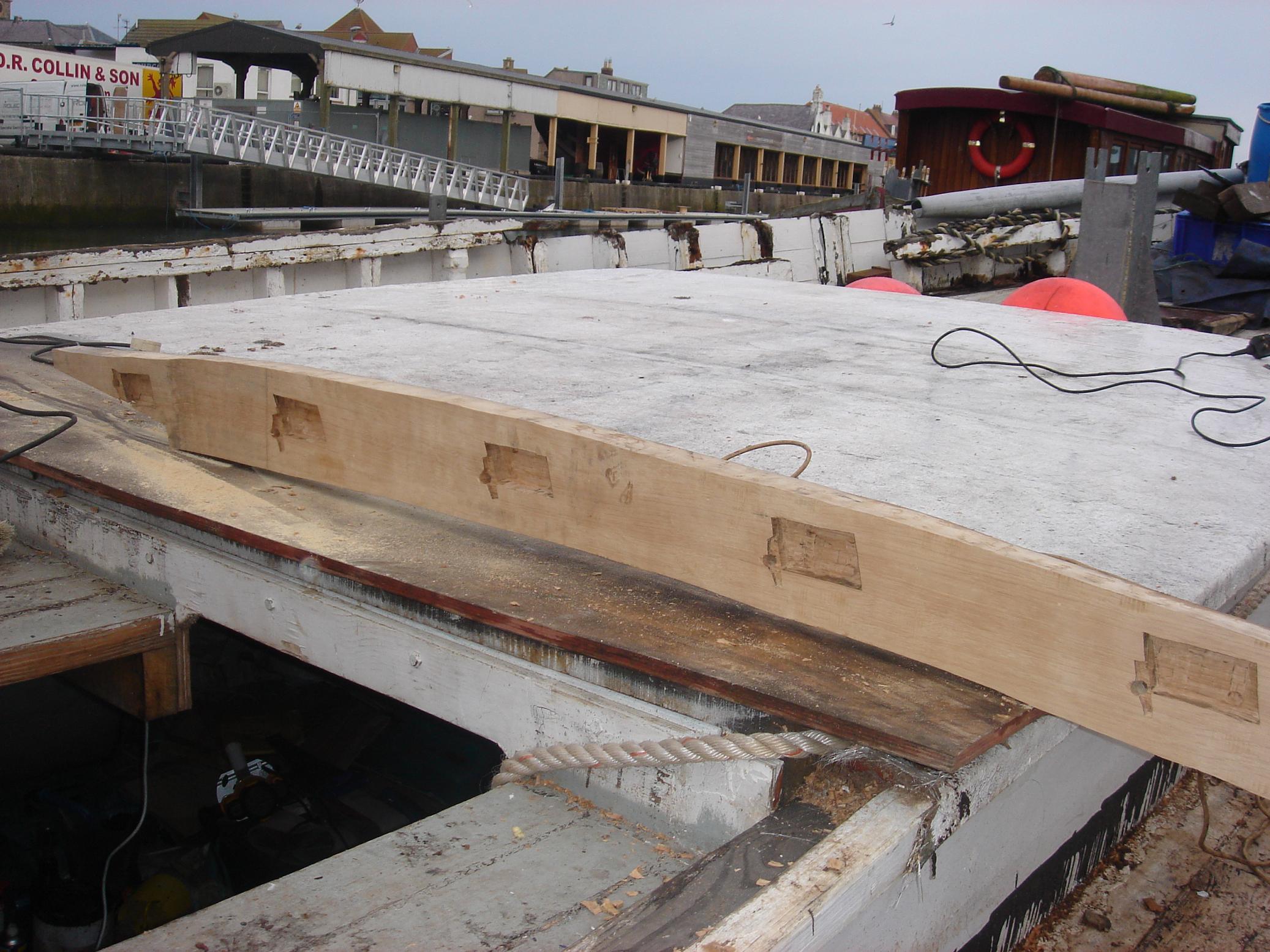 | 27/08/2013 | The upstand for the escape hatch stops the rainwater running down the deck and into the hole. Two oak blocks to be shaped for the mast base | DSCN4143 |
