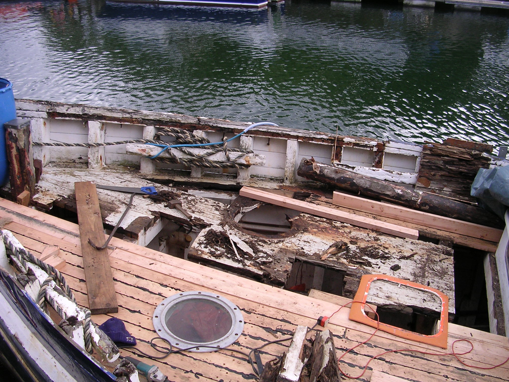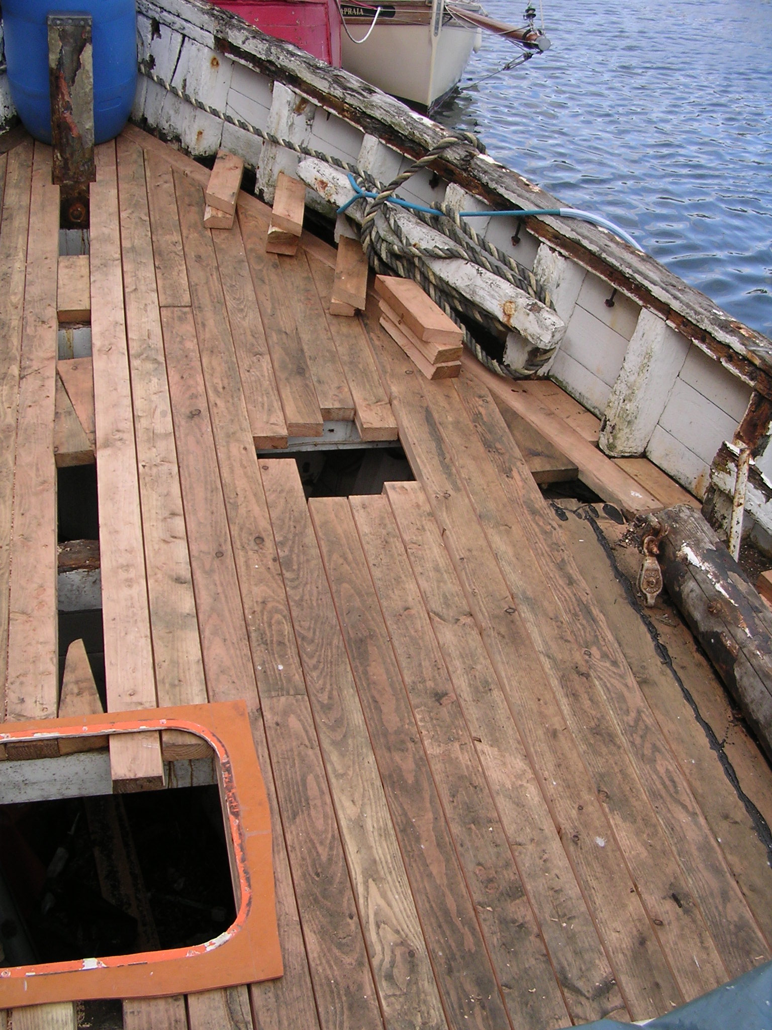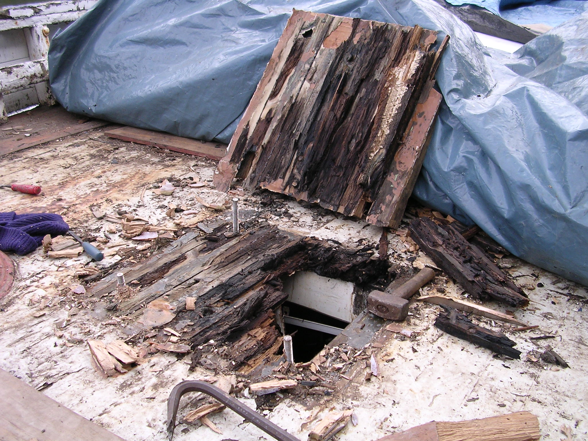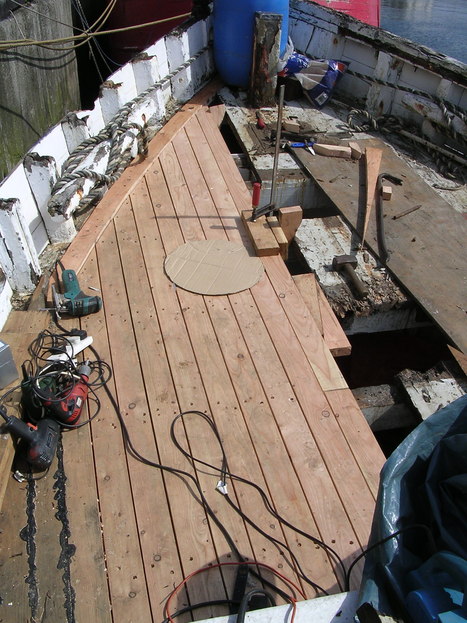 | 30/05/2013 | The small hatch that carried the belt drive to the original winch is now gone and this is where the deck porthole and escape hatch will go | DSCN4047 |