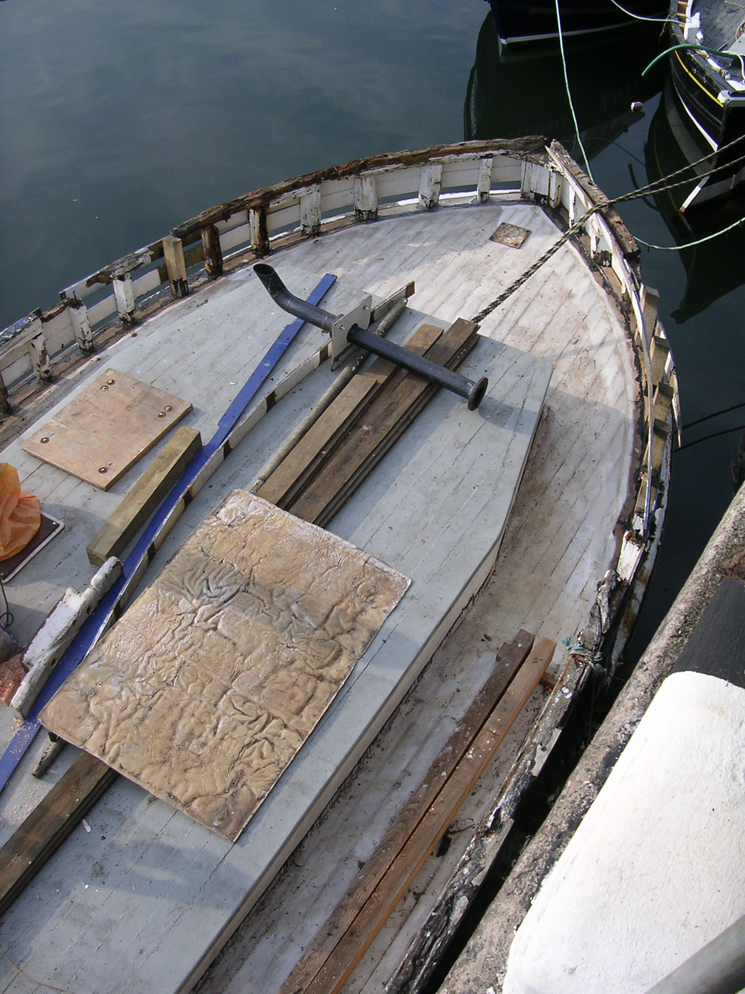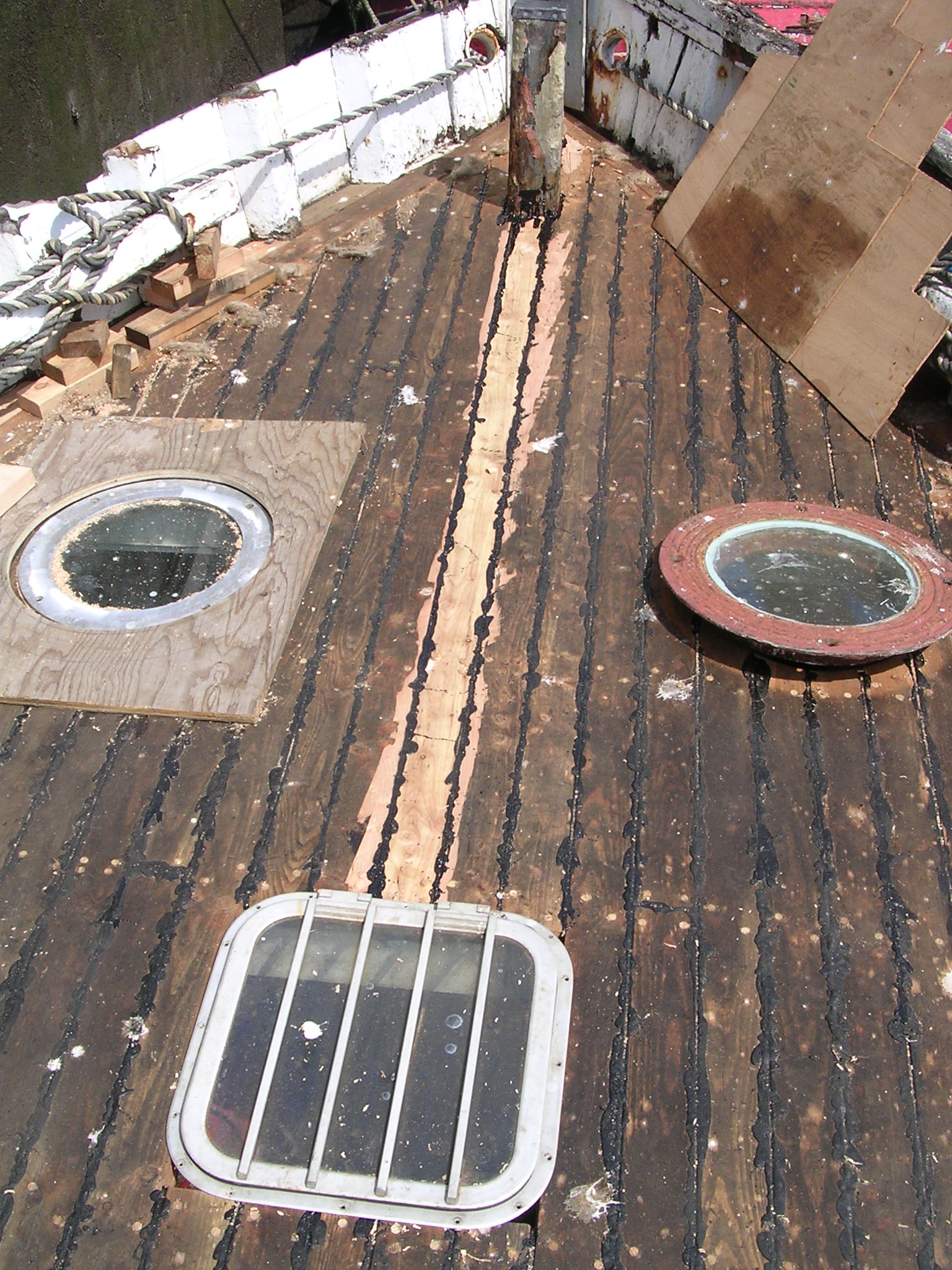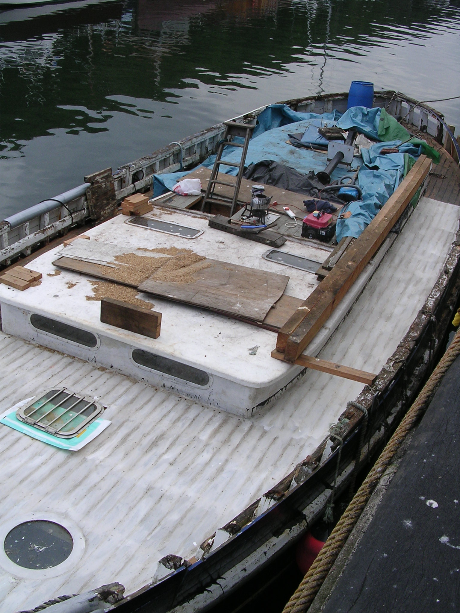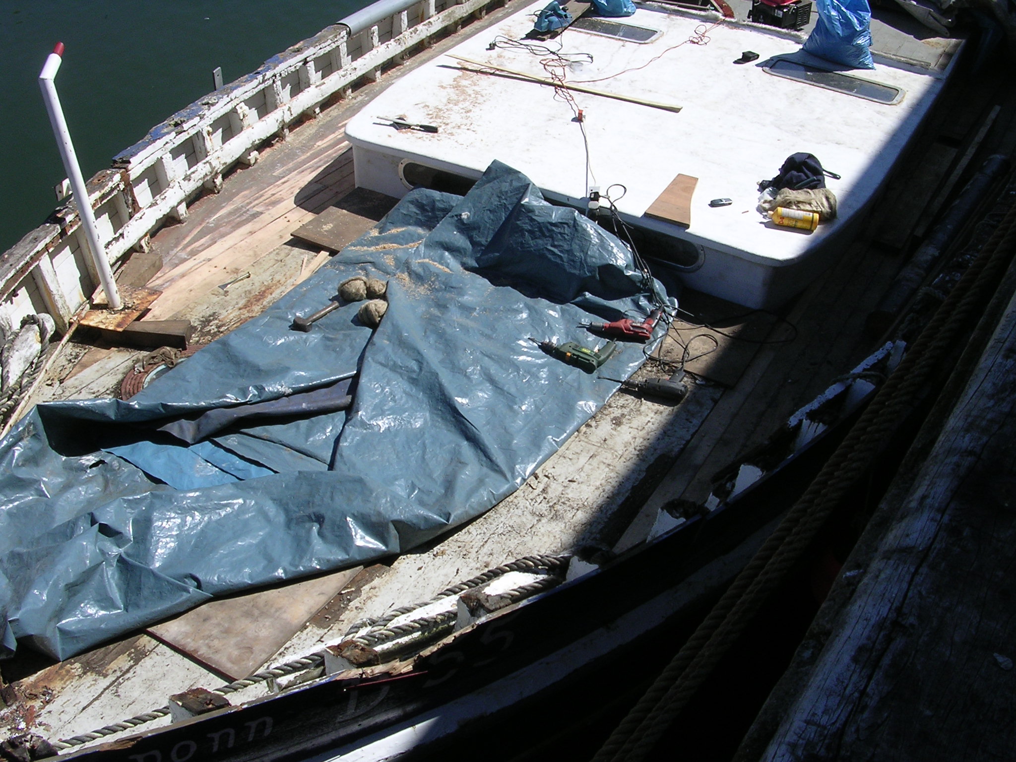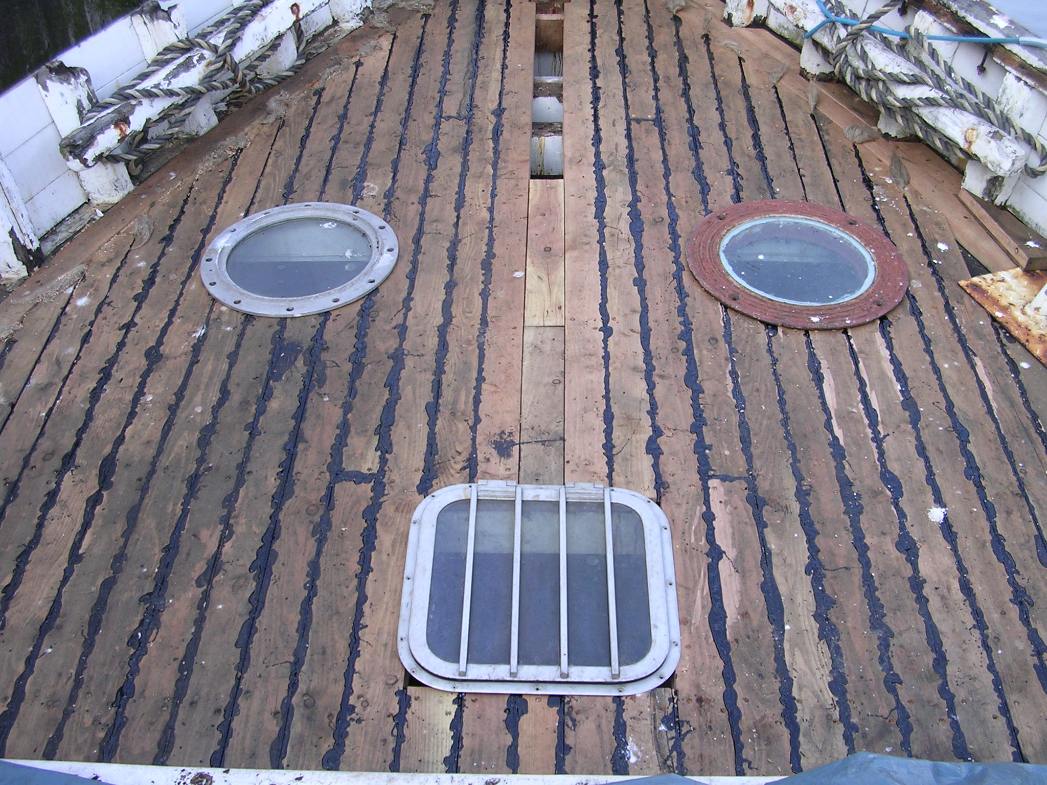 | 21/07/2013 | A coat of wood primer on the foredeck. Reacts with the tar but doesn't matter, top coat will hide that | DSCN4125 |