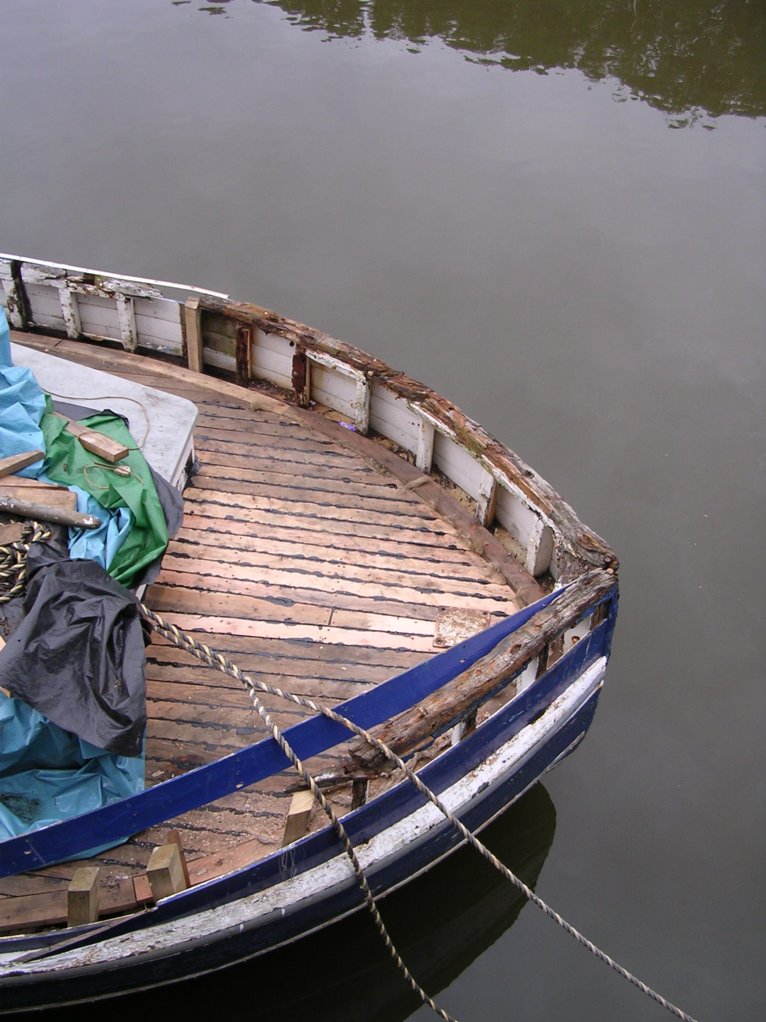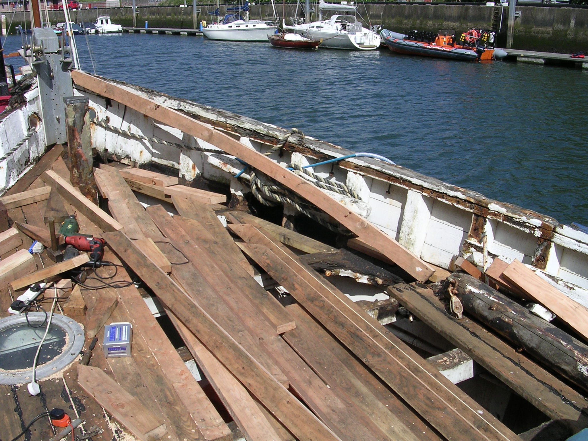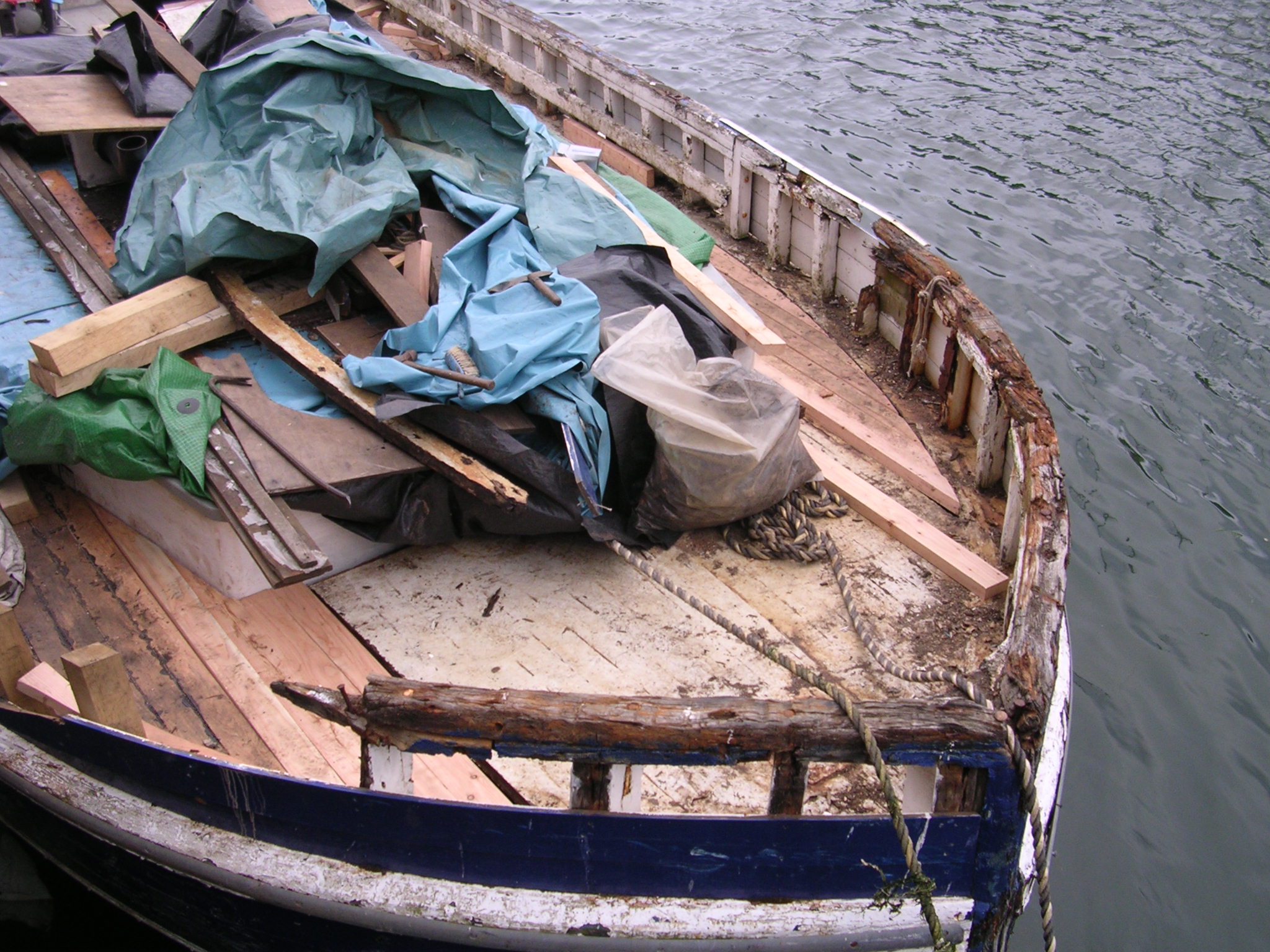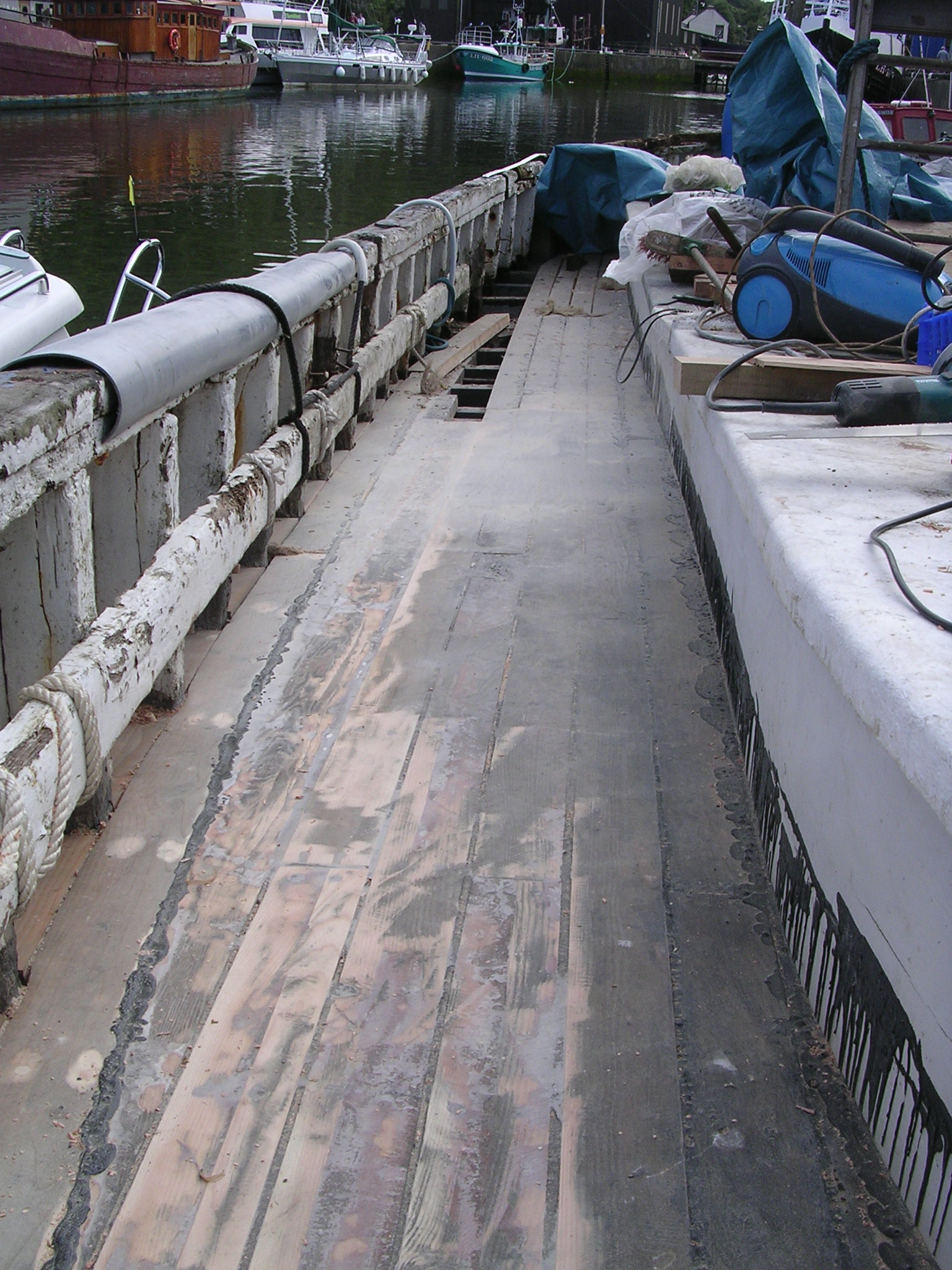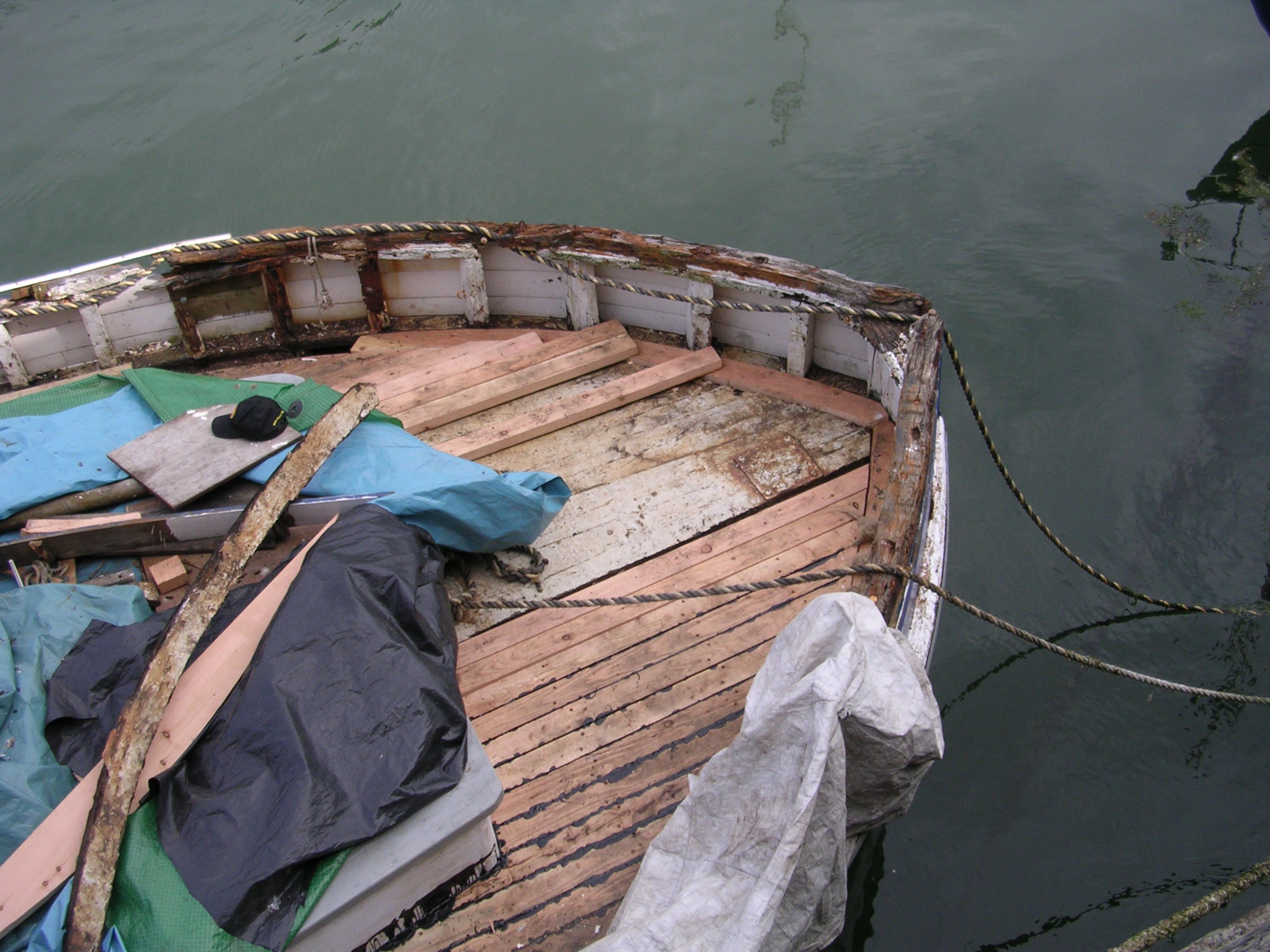 | 21/07/2013 | A coat of wood primer on the foredeck. Reacts with the tar but doesn't matter, top coat will hide that | DSCN4125 |