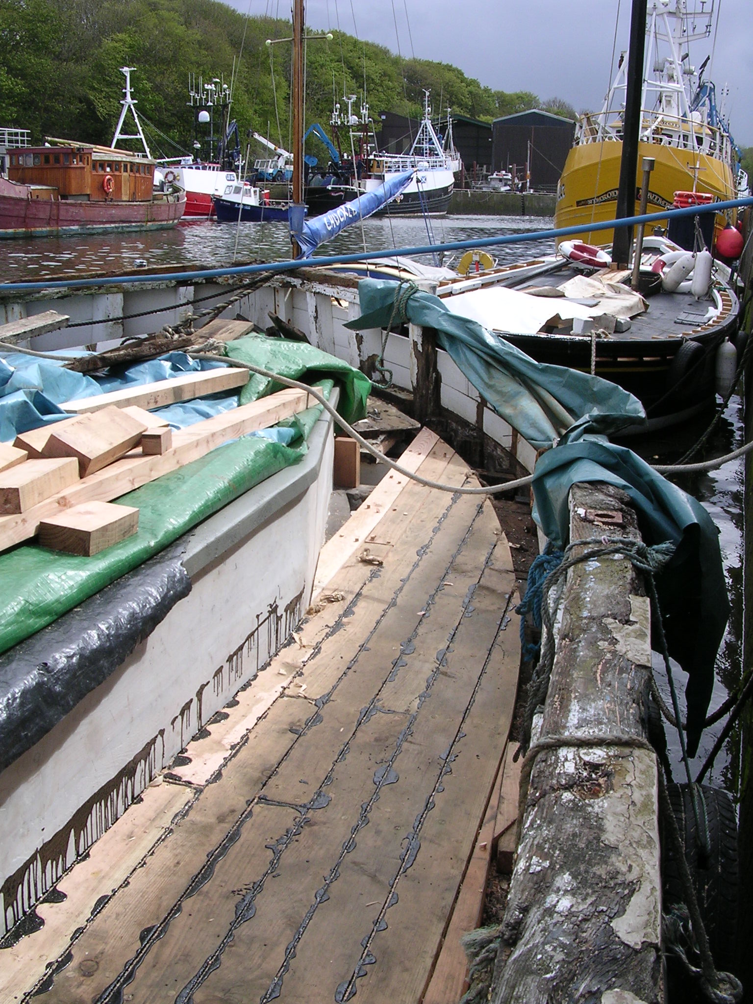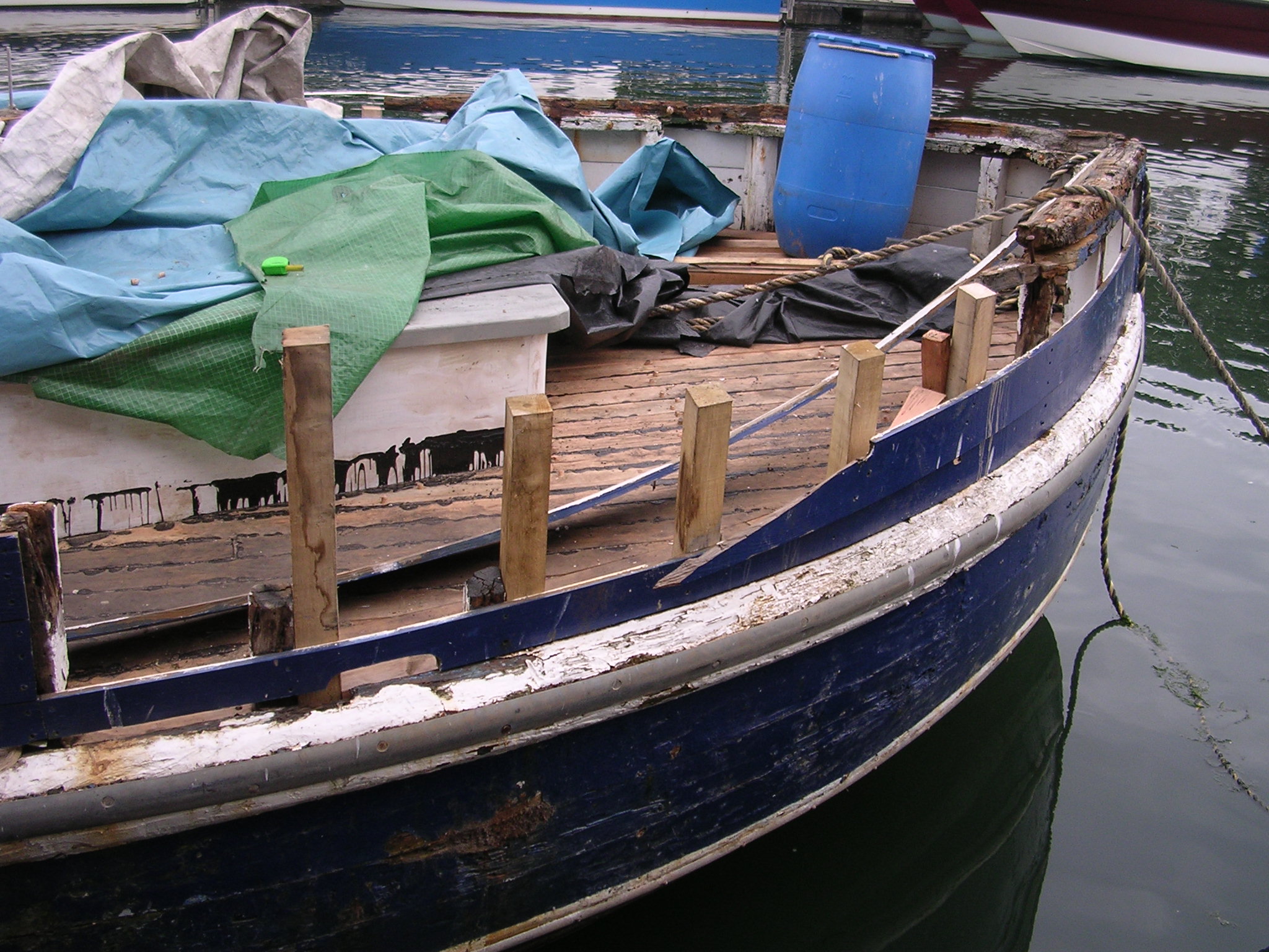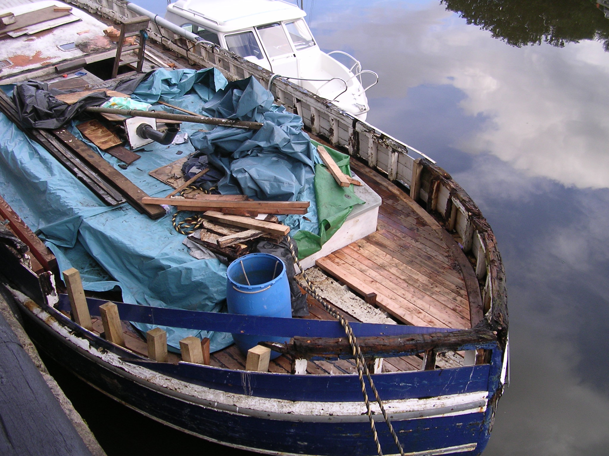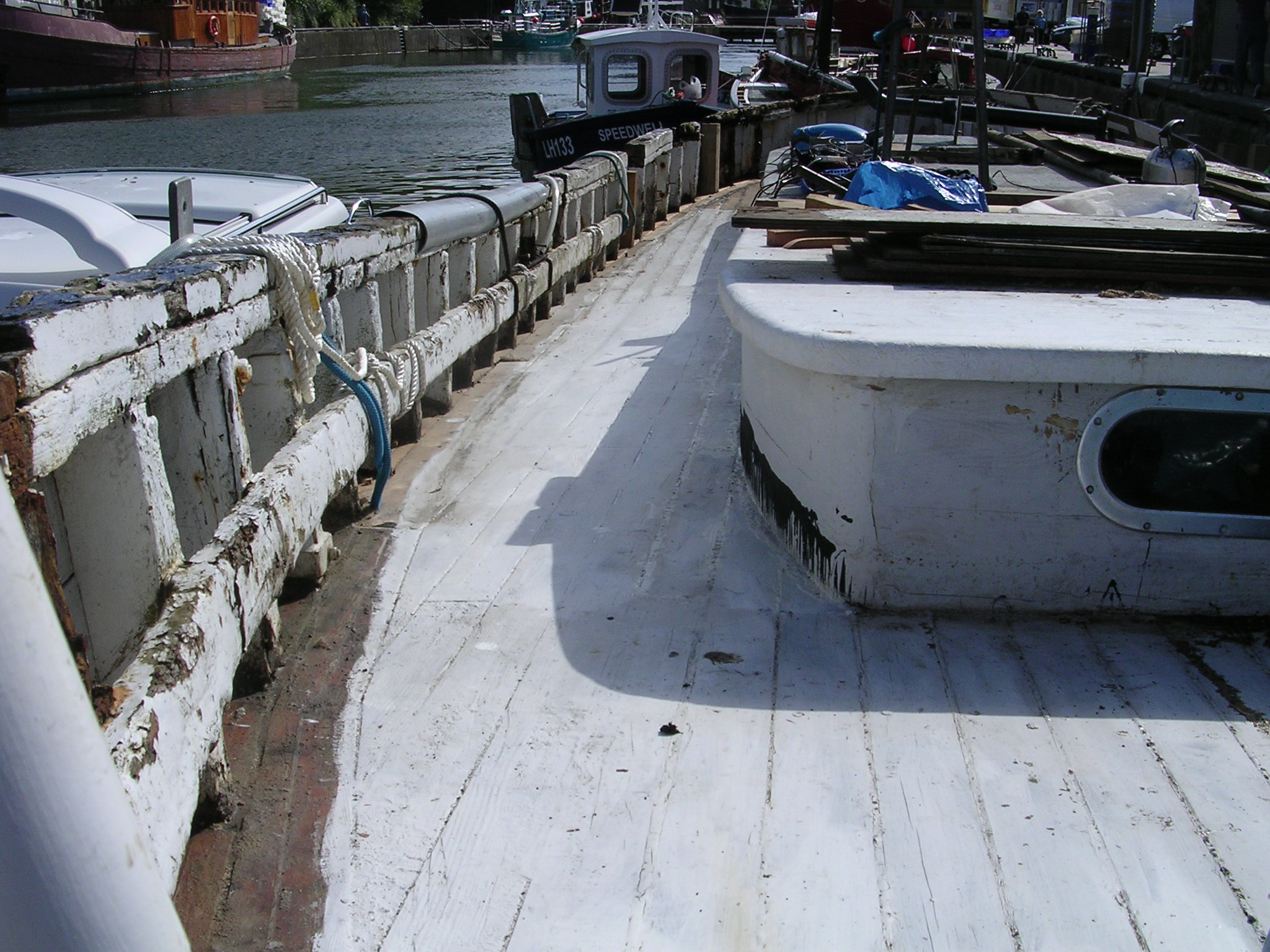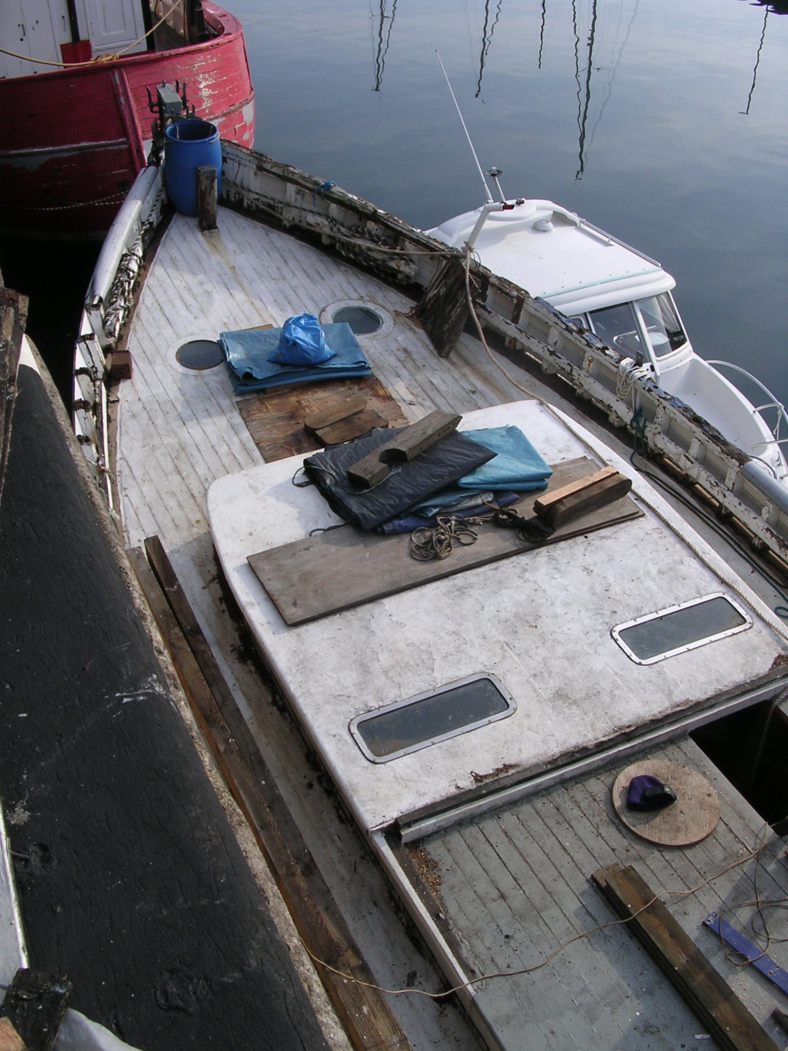 | 21/07/2013 | A coat of wood primer on the foredeck. Reacts with the tar but doesn't matter, top coat will hide that | DSCN4125 |