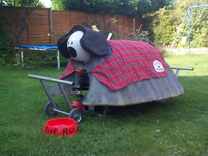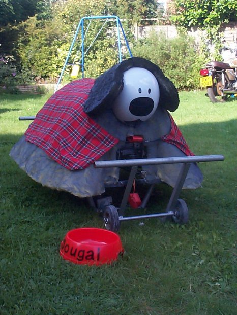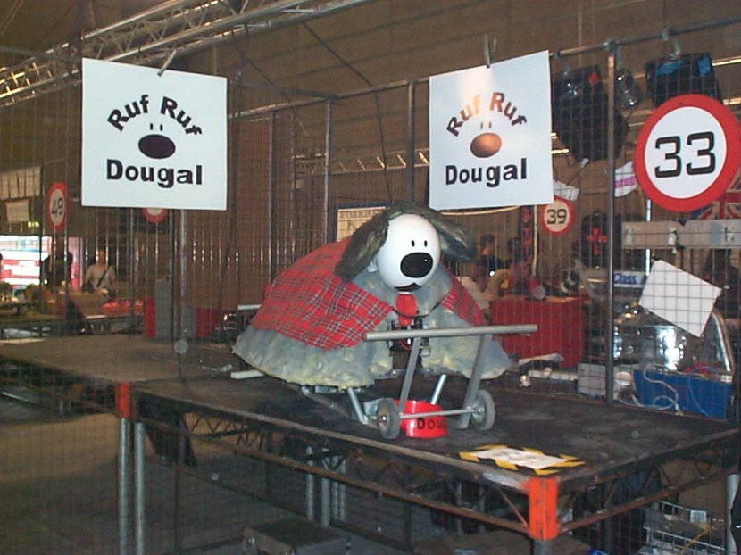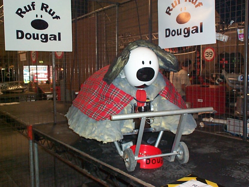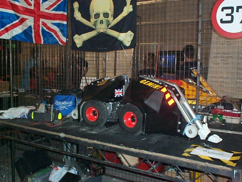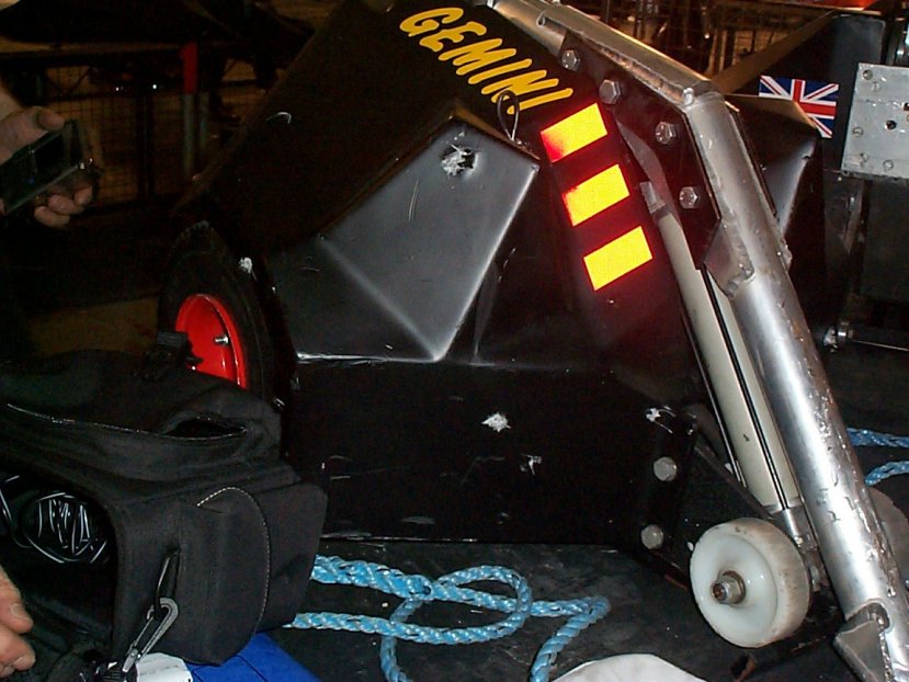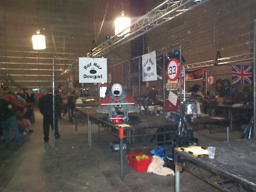 A couple of weeks after the live event we received a letter informing us of success. We had qualified for Robot Wars Series 5 and would be filming at Elstree on the 26th August, exactly one month after the live event. After much discussion over the contracts and in particular copyright we decided to modify Ruf Ruf Dougal to prevent infringing the Magic Roundabout copyright probably held by 'AB Productions'. The new Dougal was most definetly of Scottish decent as can be seen by his new tartan coat. He'd also got shorter ears, a longer tail and was now black and grey but he still looked cute. Filming could possibly last all week depending on our success so we decided to set up a base camp on a local caravan site. Whilst Mentorn would have covered accommodation for team members their budget wouldn't stretch to family and the caravan site provided a good focal point to review progress with our fans (and gather more). Series 5 is now well and truly over so I think we can tell you we fought the clusterbot Gemini. Despite being told we'd only last 5 seconds without a self righting mechanism Gemini didn't get us over. It was a fairly one way fight though but we only finally gave up when the removable link got snagged and pulled out.