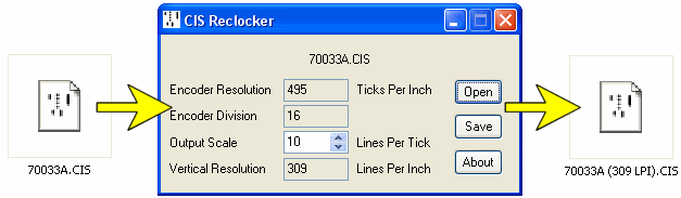 CIS-RECLOCK converts a Type 2 (or 3) Encoder clocked file into a Type 4 Stepper scanner format file, by dropping or duplicating lines to ensure a constant number of scan lines between each encoder clock. This irons out any variations in vertical scale due to acceleration or other irregularities in roll speed during scanning, while at the same time matching the vertical scale to the horizontal scale, so that holes appear more nearly round in the viewer.