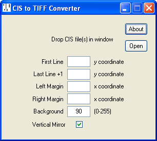 CIS2TIFF converts CIS files into 8-bit greyscale TIFF image files with LZW compression.