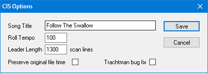 | First Line | Allows the tapered leader to be excluded, or individual songs to be extracted from a medley roll. TIFF Viewer can provide the appropriate line numbers. |